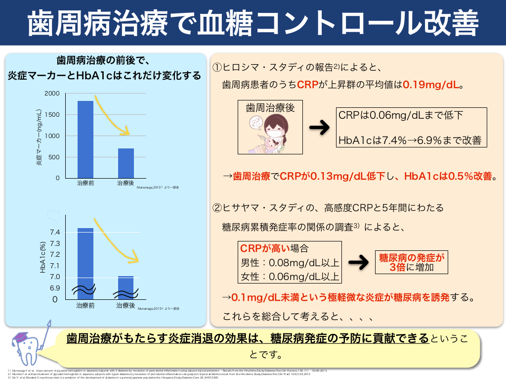 #13. 歯周病治療で血糖コントロール改善 歯周病治療の前後で、 炎症マーカーとHbA1cはこれだけ変化する  ①ヒロシマ・スタディの報告2)によると、 歯周病患者のうちCRPが上昇群の平均値は0.19mg/dL。  炎症マーカー(ng/mL)  2000  歯周治療後  1500  1000  HbA1cは7.4%→6.9%まで改善  500  0  治療前  治療後  →歯周治療でCRPが0.13mg/dL低下し、HbA1cは0.5%改善。 Munenaga,20131)より一部改  ②ヒサヤマ・スタディの、高感度CRPと5年間にわたる  7.5  HbA1c(%)  CRPは0.06mg/dLまで低下  糖尿病累積発症率の関係の調査3)によると、  7.4 7.4 7.3  CRPが高い場合 男性:0.08mg/dL以上 女性:0.06mg/dL以上  7.2 7.3 7.1 7.0 7.1 6.9 7.0 0  治療前  治療後  糖尿病の発症が 3倍に増加  →0.1mg/dL未満という極軽微な炎症が糖尿病を誘発する。 Munenaga,20131)より一部改  これらを総合して考えると、、、、  歯周治療がもたらす炎症消退の効果は、糖尿病発症の予防に貢献できるというこ とです。 1)Munenaga Y et al.:Improvement of glycated hemoglobin in Japanese subjects with 2 diabetes by resolution of periodontal inflammation using adjunct topical antibiotics :Results from the Hiroshima Study.Diabetes Res Clin Practice.,100(1):53-60.2013. 2)Muneta Y et al.:Improbvement of glycated hemoglobin in Japanese subjects with type2 diabetes by resolution of periodontal inflammation using adjunct topical antibiotics:result from the Hiroshima Stud