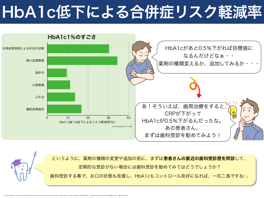#14. HbA1c低下による合併症リスク軽減率 HbA1c1%のすごさ HbA1cがあと0.5%下がれば目標値に なるんだけどなぁ・・ 薬剤の種類変えるか、追加してみるか・・・  末梢血管疾患による手足の切断  微小血管障害  脳卒中  心筋梗塞  心不全  糖尿病関連死 0  13 25 38 HbA1c値1%低下によるリスク軽減率(%)  50  Irene MS,20001)より一部改  あ!そういえば、歯周治療をすると CRPが下がって HbA1cが0.5%下がるんだったな。 あの患者さん、 まずは歯科受診を勧めてみよう!  というように、薬剤の種類の変更や追加の前に、まずは患者さんの直近の歯科受診歴を問診して、 定期的な受診がない場合には歯科受診を勧めてみてはどうでしょうか? 歯科受診する事で、お口の状態も改善し、HbA1cもコントロール良好になれば、一石二鳥ですね✨  1)Irene MS et al.:Association of Glycaemia with macro vascular and micro vascular complications of type 2 diabetes(UKPDS 35):prospective observational study.BMJ.,321:405-412,2000.