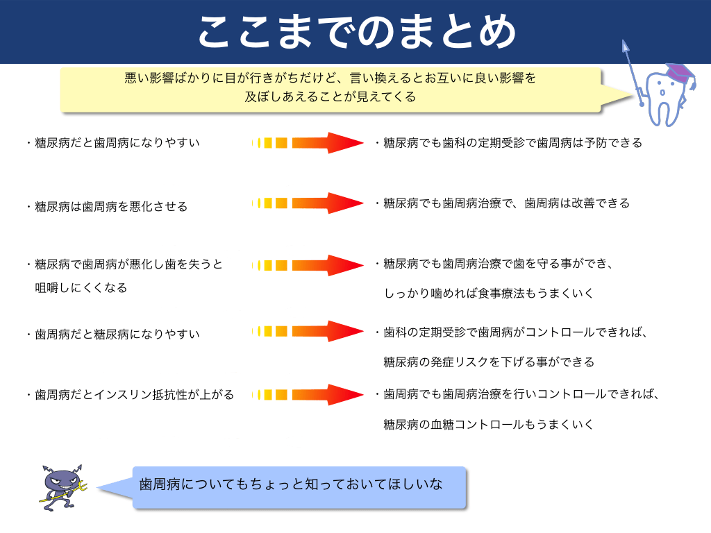 #15. ここまでのまとめ 悪い影響ばかりに目が行きがちだけど、言い換えるとお互いに良い影響を 及ぼしあえることが見えてくる  ・糖尿病だと歯周病になりやすい  ・糖尿病でも歯科の定期受診で歯周病は予防できる  ・糖尿病は歯周病を悪化させる  ・糖尿病でも歯周病治療で、歯周病は改善できる  ・糖尿病で歯周病が悪化し歯を失うと  ・糖尿病でも歯周病治療で歯を守る事ができ、  咀嚼しにくくなる  しっかり噛めれば食事療法もうまくいく  ・歯周病だと糖尿病になりやすい  ・歯科の定期受診で歯周病がコントロールできれば、 糖尿病の発症リスクを下げる事ができる  ・歯周病だとインスリン抵抗性が上がる  ・歯周病でも歯周病治療を行いコントロールできれば、 糖尿病の血糖コントロールもうまくいく  歯周病についてもちょっと知っておいてほしいな