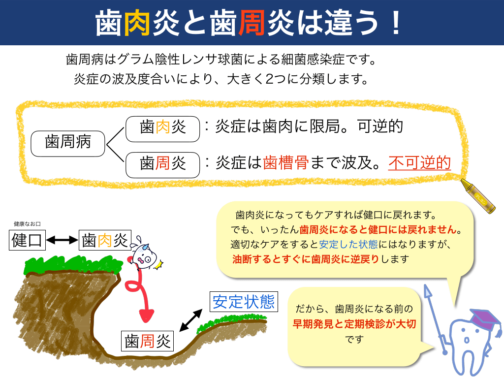 #16. 歯肉炎と歯周炎は違う! 歯周病はグラム陰性レンサ球菌による細菌感染症です。 炎症の波及度合いにより、大きく2つに分類します。  歯肉炎 :炎症は歯肉に限局。可逆的  歯周病  歯周炎 :炎症は歯槽骨まで波及。不可逆的  健康なお口  健口  歯肉炎  歯肉炎になってもケアすれば健口に戻れます。 でも、いったん歯周炎になると健口には戻れません。 適切なケアをすると安定した状態にはなりますが、 油断するとすぐに歯周炎に逆戻りします  安定状態 歯周炎  だから、歯周炎になる前の  早期発見と定期検診が大切 です