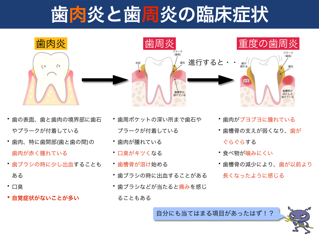 #17. 歯肉炎と歯周炎の臨床症状 歯肉炎  歯周炎  重度の歯周炎 進行すると・・  • 歯の表面、歯と歯肉の境界部に歯石 やプラークが付着している  • 歯肉、特に歯間部(歯と歯の間)の 歯肉が赤く腫れている  • 歯ブラシの時に少し出血することも ある  • 口臭 • 自覚症状がないことが多い  • 歯周ポケットの深い所まで歯石や プラークが付着している  • 歯肉が腫れている • 口臭がキツくなる • 歯槽骨が溶け始める • 歯ブラシの時に出血することがある • 歯ブラシなどが当たると痛みを感じ  • 歯肉がブヨブヨに腫れている • 歯槽骨の支えが弱くなり、歯が ぐらぐらする  • 食べ物が噛みにくい • 歯槽骨の減少により、歯が以前より 長くなったように感じる  ることもある  自分にも当てはまる項目があったはず!?