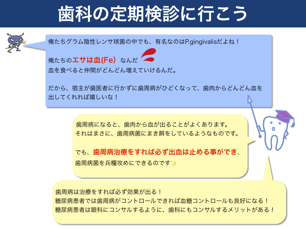 #18. 歯科の定期検診に行こう 俺たちグラム陰性レンサ球菌の中でも、有名なのはP.gingivalisだよね! 俺たちのエサは血(Fe)なんだ 血を食べると仲間がどんどん増えていけるんだ。 だから、宿主が歯医者に行かずに歯周病がひどくなって、歯肉からどんどん血を 出してくれれば嬉しいな!  歯周病になると、歯肉から血が出ることがよくあります。 それはまさに、歯周病菌にまき餌をしているようなものです。 でも、歯周病治療をすれば必ず出血は止める事ができ、 歯周病菌を兵糧攻めにできるのです✨  歯周病は治療をすれば必ず効果が出る! 糖尿病患者では歯周病がコントロールできれば血糖コントロールも良好になる! 糖尿病患者は眼科にコンサルするように、歯科にもコンサルするメリットがある!