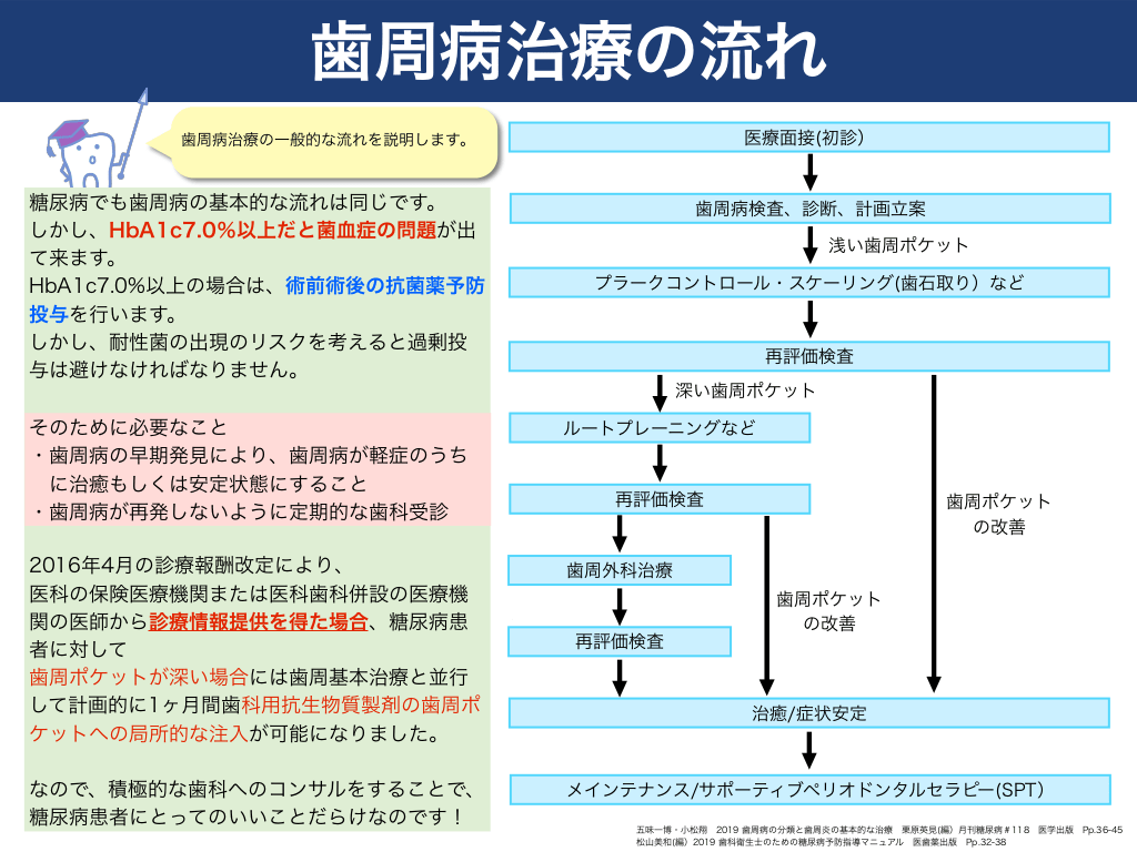 #19. 歯周病治療の流れ 医療面接(初診)  歯周病治療の一般的な流れを説明します。  糖尿病でも歯周病の基本的な流れは同じです。 しかし、HbA1c7.0%以上だと菌血症の問題が出 て来ます。 HbA1c7.0%以上の場合は、術前術後の抗菌薬予防 投与を行います。 しかし、耐性菌の出現のリスクを考えると過剰投 与は避けなければなりません。  歯周病検査、診断、計画立案 浅い歯周ポケット プラークコントロール・スケーリング(歯石取り)など  再評価検査 深い歯周ポケット  そのために必要なこと ・歯周病の早期発見により、歯周病が軽症のうち に治癒もしくは安定状態にすること に治癒もしくは安定状態にすること ・歯周病が再発しないように定期的な歯科受診  ルートプレーニングなど  2016年4月の診療報酬改定により、 医科の保険医療機関または医科歯科併設の医療機 関の医師から診療情報提供を得た場合、糖尿病患 者に対して 歯周ポケットが深い場合には歯周基本治療と並行 して計画的に1ヶ月間歯科用抗生物質製剤の歯周ポ ケットへの局所的な注入が可能になりました。  歯周外科治療  なので、積極的な歯科へのコンサルをすることで、 糖尿病患者にとってのいいことだらけなのです!  メインテナンス/サポーティブペリオドンタルセラピー(SPT)  再評価検査  歯周ポケット の改善  歯周ポケット の改善 再評価検査  治癒/症状安定  五味一博・小松翔 2019 歯周病の分類と歯周炎の基本的な治療 栗原英見(編)月刊糖尿病#118 松山美和(編)2019 歯科衛生士のための糖尿病予防指導マニュアル 医歯薬出版 Pp.32-38  医学出版  Pp.36-45