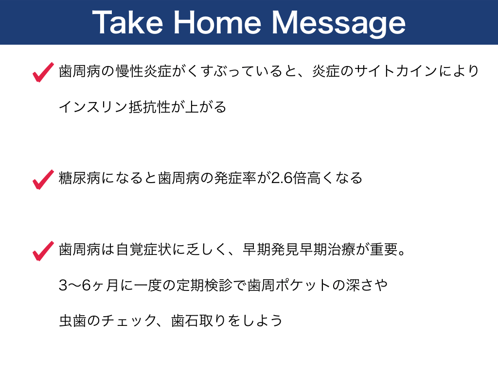 #20. Take Home Message 歯周病の慢性炎症がくすぶっていると、炎症のサイトカインにより インスリン抵抗性が上がる  糖尿病になると歯周病の発症率が2.6倍高くなる  歯周病は自覚症状に乏しく、早期発見早期治療が重要。 3〜6ヶ月に一度の定期検診で歯周ポケットの深さや 虫歯のチェック、歯石取りをしよう