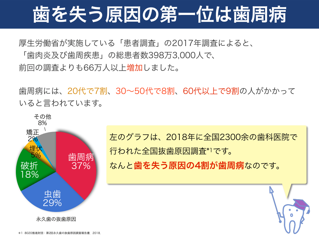 #3. 歯を失う原因の第一位は歯周病 厚生労働省が実施している「患者調査」の2017年調査によると、 「歯肉炎及び歯周疾患」の総患者数398万3,000人で、 前回の調査よりも66万人以上増加しました。 歯周病には、20代で7割、30〜50代で8割、60代以上で9割の人がかかって いると言われています。 その他 8%  矯正 2% 埋伏 5%  左のグラフは、2018年に全国2300余の歯科医院で  歯周病 37%  破折 18% 虫歯 29%  永久歯の抜歯原因 *1 8020推進財団:第2回永久歯の抜歯原因調査報告書.2018.  行われた全国抜歯原因調査*1です。 なんと歯を失う原因の4割が歯周病なのです。