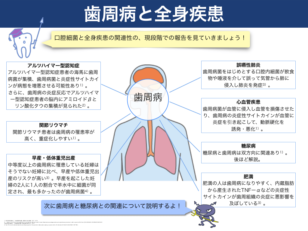 #4. 歯周病と全身疾患 口腔細菌と全身疾患の関連性の、現段階での報告を見ていきましょう!  アルツハイマー型認知症 アルツハイマー型認知症患者の海馬に歯周 病菌が集積、歯周病菌と炎症性サイトカイ ンが病態を増悪させる可能性あり1)。 さらに、歯周病の炎症反応でアルツハイマ ー型認知症患者の脳内にアミロイドβと リン酸化タウの集積が見られた2)。  誤嚥性肺炎 歯周病菌をはじめとする口腔内細菌が飲食 物や唾液を介して誤って気管から肺に 侵入し肺炎を発症3)。  歯周病  関節リウマチ 関節リウマチ患者は歯周病の罹患率が 高く、重症化しやすい1)。  早産・低体重児出産 中等度以上の歯周病に罹患している妊婦は そうでない妊婦に比べ、早産や低体重児出 産のリスクが高い3)。早産を起こした妊 婦の2人に1人の割合で羊水中に細菌が同 定され、最も多かったのが歯周病菌4)。  次に歯周病と糖尿病との関連について説明するよ! 1)特定非営利活動法人 2)  日本歯周病学会編、歯周病と全身の健康  2015.2016.  Ileivski V et al.:Chronic oral application of a periodontal pathogen result in brain inflammation,neurodegeneration and amyloid beta production in wild in type mice,PloS One,13(10):20204941,2018.(PMID 30281647)  3)特定非営利活動法人  日本歯周病学会編  歯周治療の指針2015.2016.  4)Han YW et al.:Uncultivated bacteria as etiologic agents of intra-amniotic inflammation leading to preterm birth,J Clin Micobiol,47(1):38-47,2009.(PMID 18971361)  心血管疾患 歯周病菌が血管に侵入し血管を損傷させた り、歯周病の炎症性サイトカインが血管に 炎症を引き起こして、動脈硬化を 誘発・悪化1)。  糖尿病 糖尿病と歯周病は双方向に関連あり1)。 後ほど解説。  肥満 肥満の人は歯周病になりやすく、内蔵