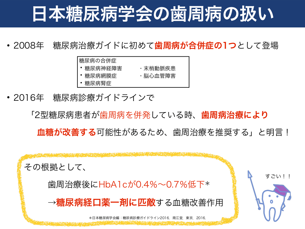 #5. 日本糖尿病学会の歯周病の扱い • 2008年  糖尿病治療ガイドに初めて歯周病が合併症の1つとして登場 糖尿病の合併症 糖尿病神経障害 糖尿病網膜症 糖尿病腎症  • • •  • 2016年  ・末梢動脈疾患 ・脳心血管障害  糖尿病診療ガイドラインで  「2型糖尿病患者が歯周病を併発している時、歯周病治療により 血糖が改善する可能性があるため、歯周治療を推奨する」と明言!  その根拠として、 すごい!!  歯周治療後にHbA1cが0.4%〜0.7%低下* →糖尿病経口薬一剤に匹敵する血糖改善作用 *日本糖尿病学会編:糖尿病診療ガイドライン2016.南江堂.東京.2016.