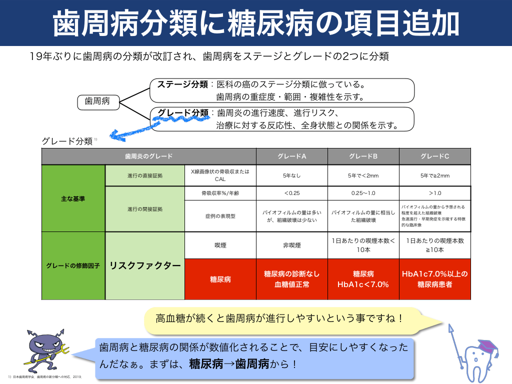 #6. 歯周病分類に糖尿病の項目追加 19年ぶりに歯周病の分類が改訂され、歯周病をステージとグレードの2つに分類  歯周病  ステージ分類:医科の癌のステージ分類に倣っている。 歯周病の重症度・範囲・複雑性を示す。 グレード分類:歯周炎の進行速度、進行リスク、 治療に対する反応性、全身状態との関係を示す。  グレード分類  1)  歯周炎のグレード 進行の直接証拠  グレードA  グレードB  グレードC  X線画像状の骨吸収または CAL  5年なし  5年で<2mm  5年で 2mm  骨吸収率%/年齢  <0.25  0.25〜1.0  >1.0  症例の表現型  バイオフィルムの量は多い が、組織破壊は少ない  バイオフィルムの量に相当し た組織破壊  喫煙  非喫煙  1日あたりの喫煙本数< 10本  1日あたりの喫煙本数 10本  糖尿病  糖尿病の診断なし 血糖値正常  糖尿病 HbA1c<7.0%  HbA1c7.0%以上の 糖尿病患者  主な基準 進行の間接証拠  グレードの修飾因子  リスクファクター  バイオフィルムの量から予想される 程度を超えた組織破壊 急速進行・早期発症を示唆する特徴 的な臨床像  高血糖が続くと歯周病が進行しやすいという事ですね! 歯周病と糖尿病の関係が数値化されることで、目安にしやすくなった んだなぁ。まずは、糖尿病→歯周病から! 1)日本歯周病学会.歯周病の新分類への対応.2019.