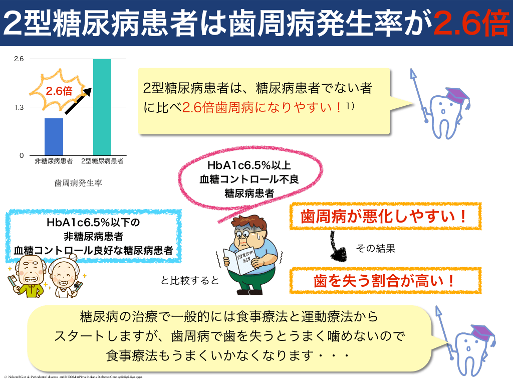 #7. 2型糖尿病患者は歯周病発生率が2.6倍 2.6  2型糖尿病患者は、糖尿病患者でない者 に比べ2.6倍歯周病になりやすい!1)  2.6倍 1.3  0  非糖尿病患者  2型糖尿病患者  HbA1c6.5%以上 血糖コントロール不良 糖尿病患者  歯周病発生率  HbA1c6.5%以下の 非糖尿病患者 血糖コントロール良好な糖尿病患者 と比較すると  歯周病が悪化しやすい! その結果  歯を失う割合が高い!  糖尿病の治療で一般的には食事療法と運動療法から スタートしますが、歯周病で歯を失うとうまく噛めないので 食事療法もうまくいかなくなります・・・ 1)Nelson RG et al.:Periodontal disease and NIDDM inPima Indians.Diabetes Care,13(8):836-840,1990.