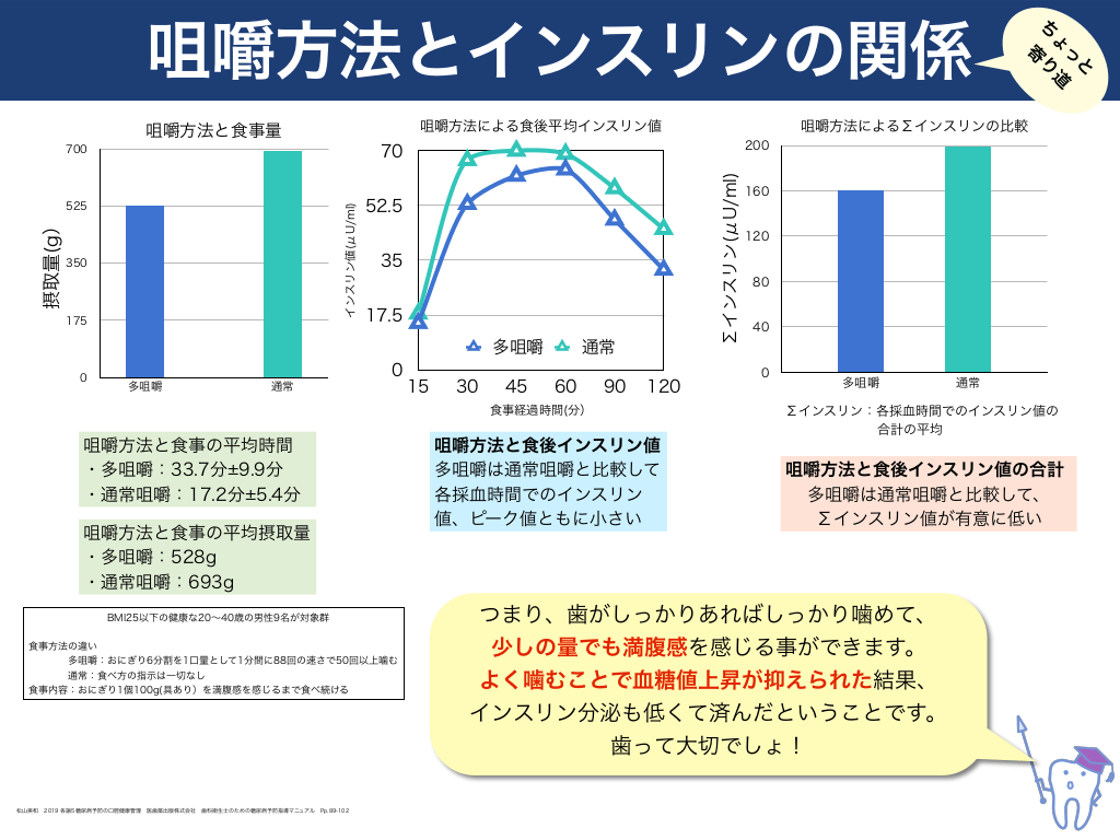 #8. 200  350  175  52.5 35 17.5 多咀嚼 0  多咀嚼  Σインスリン(μU/ml)  インスリン値(μU/ml)  摂取量(g)  525  0  咀嚼方法によるΣインスリンの比較  70  700  通常  15  30  45  通常 60  90  120  食事経過時間(分)  咀嚼方法と食事の平均時間 ・多咀嚼:33.7分 9.9分 ・通常咀嚼:17.2分 5.4分  BMI25以下の健康な20〜40歳の男性9名が対象群 食事方法の違い 多咀嚼:おにぎり6分割を1口量として1分間に88回の速さで50回以上噛む 通常:食べ方の指示は一切なし 食事内容:おにぎり1個100g(具あり)を満腹感を感じるまで食べ続ける  160  120  80  40  0  多咀嚼  咀嚼方法と食後インスリン値の合計 多咀嚼は通常咀嚼と比較して、 Σインスリン値が有意に低い  つまり、歯がしっかりあればしっかり噛めて、 少しの量でも満腹感を感じる事ができます。 よく噛むことで血糖値上昇が抑えられた結果、 インスリン分泌も低くて済んだということです。 歯って大切でしょ!  松山美和  2019 各論5糖尿病予防の口腔健康管理  医歯薬出版株式会社  歯科衛生士のための糖尿病予防指導マニュアル  Pp.89-102  通常  Σインスリン:各採血時間でのインスリン値の 合計の平均  咀嚼方法と食後インスリン値 多咀嚼は通常咀嚼と比較して 各採血時間でのインスリン 値、ピーク値ともに小さい  咀嚼方法と食事の平均摂取量 ・多咀嚼:528g ・通常咀嚼:693g  と っ ょ 道 り 寄  咀嚼方法による食後平均インスリン値  咀嚼方法と食事量  ち  咀嚼方法とインスリンの関係