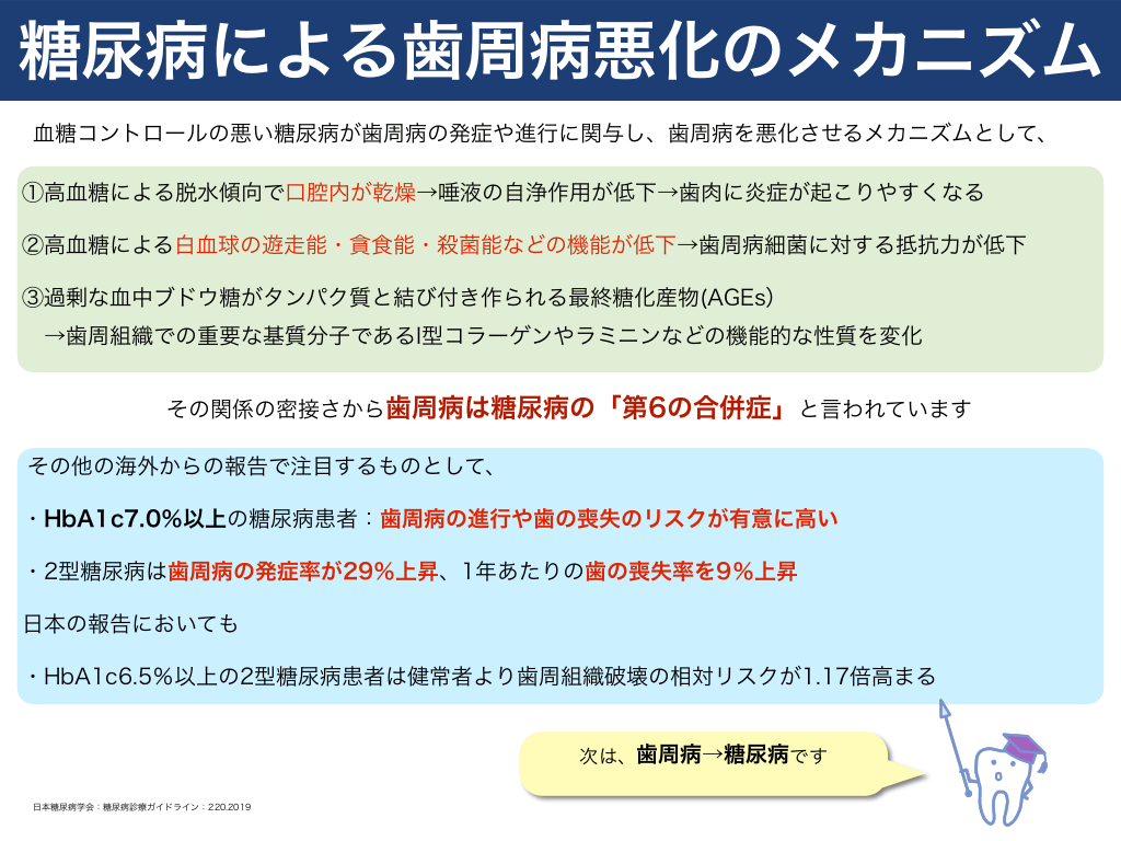 #9. 糖尿病による歯周病悪化のメカニズム 血糖コントロールの悪い糖尿病が歯周病の発症や進行に関与し、歯周病を悪化させるメカニズムとして、 ①高血糖による脱水傾向で口腔内が乾燥→唾液の自浄作用が低下→歯肉に炎症が起こりやすくなる ②高血糖による白血球の遊走能・貪食能・殺菌能などの機能が低下→歯周病細菌に対する抵抗力が低下 ③過剰な血中ブドウ糖がタンパク質と結び付き作られる最終糖化産物(AGEs) →歯周組織での重要な基質分子であるI型コラーゲンやラミニンなどの機能的な性質を変化 その関係の密接さから歯周病は糖尿病の「第6の合併症」と言われています その他の海外からの報告で注目するものとして、 ・HbA1c7.0%以上の糖尿病患者:歯周病の進行や歯の喪失のリスクが有意に高い ・2型糖尿病は歯周病の発症率が29%上昇、1年あたりの歯の喪失率を9%上昇 日本の報告においても ・HbA1c6.5%以上の2型糖尿病患者は健常者より歯周組織破壊の相対リスクが1.17倍高まる  次は、歯周病→糖尿病です 日本糖尿病学会:糖尿病診療ガイドライン:220.2019