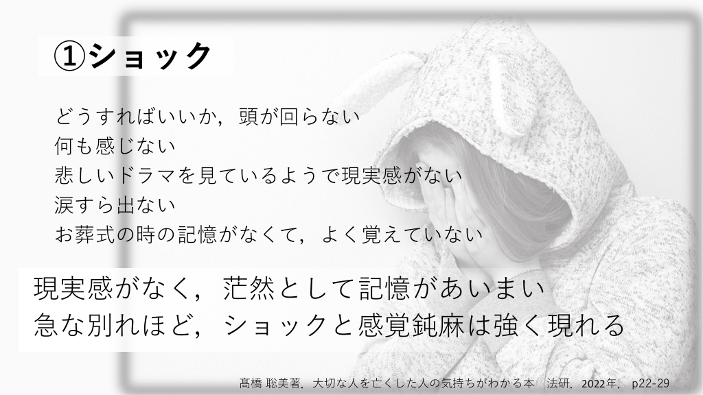 ①ショック どうすればいいか,頭が回らない 何も感じない 悲しいドラマを見ているようで現実感がない 涙すら出ない お葬式の時の記憶がなくて,よく覚えていない 現実感がなく,茫然として記憶があいまい 急な別れほど,ショックと感覚鈍麻は強く現れる 髙橋 聡美著.大切な人を亡くした人の気持ちがわかる本 法研.2022年. p22-29 #12.