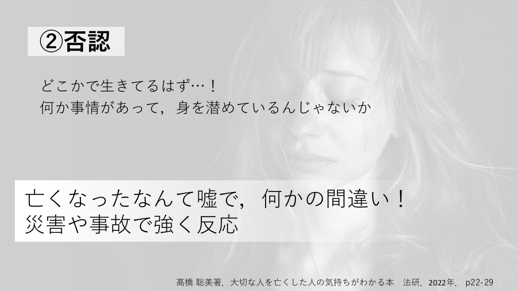②否認 どこかで生きてるはず…! 何か事情があって,身を潜めているんじゃないか 亡くなったなんて嘘で,何かの間違い! 災害や事故で強く反応 髙橋 聡美著.大切な人を亡くした人の気持ちがわかる本 法研.2022年. p22-29 #13.