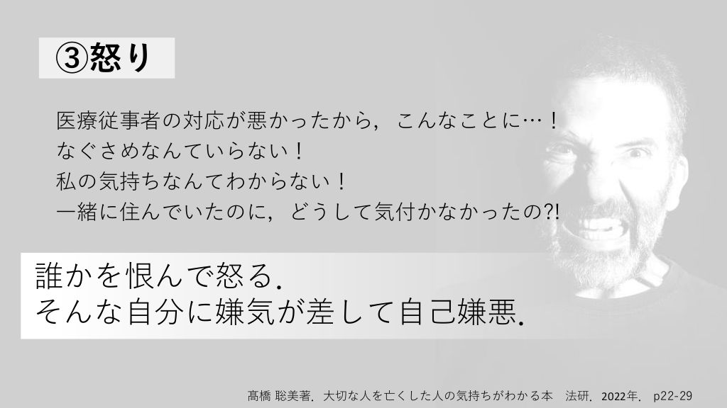 ③怒り 医療従事者の対応が悪かったから,こんなことに…! なぐさめなんていらない! 私の気持ちなんてわからない! 一緒に住んでいたのに,どうして気付かなかったの?! 誰かを恨んで怒る. そんな自分に嫌気が差して自己嫌悪. 髙橋 聡美著.大切な人を亡くした人の気持ちがわかる本 法研.2022年. p22-29 #14.