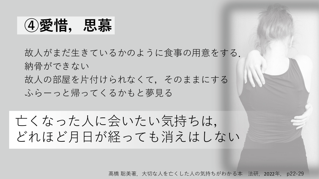 ④愛惜,思慕 故人がまだ生きているかのように食事の用意をする. 納骨ができない 故人の部屋を片付けられなくて,そのままにする ふらーっと帰ってくるかもと夢見る 亡くなった人に会いたい気持ちは, どれほど月日が経っても消えはしない 髙橋 聡美著.大切な人を亡くした人の気持ちがわかる本 法研.2022年. p22-29 悲しみの受容と再適応の過程 #15.