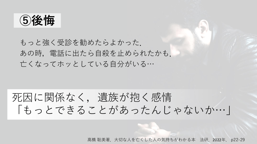 ⑤後悔 もっと強く受診を勧めたらよかった. あの時,電話に出たら自殺を止められたかも. 亡くなってホッとしている自分がいる… 死因に関係なく,遺族が抱く感情 「もっとできることがあったんじゃないか…」 髙橋 聡美著.大切な人を亡くした人の気持ちがわかる本 法研.2022年. p22-29 #16.