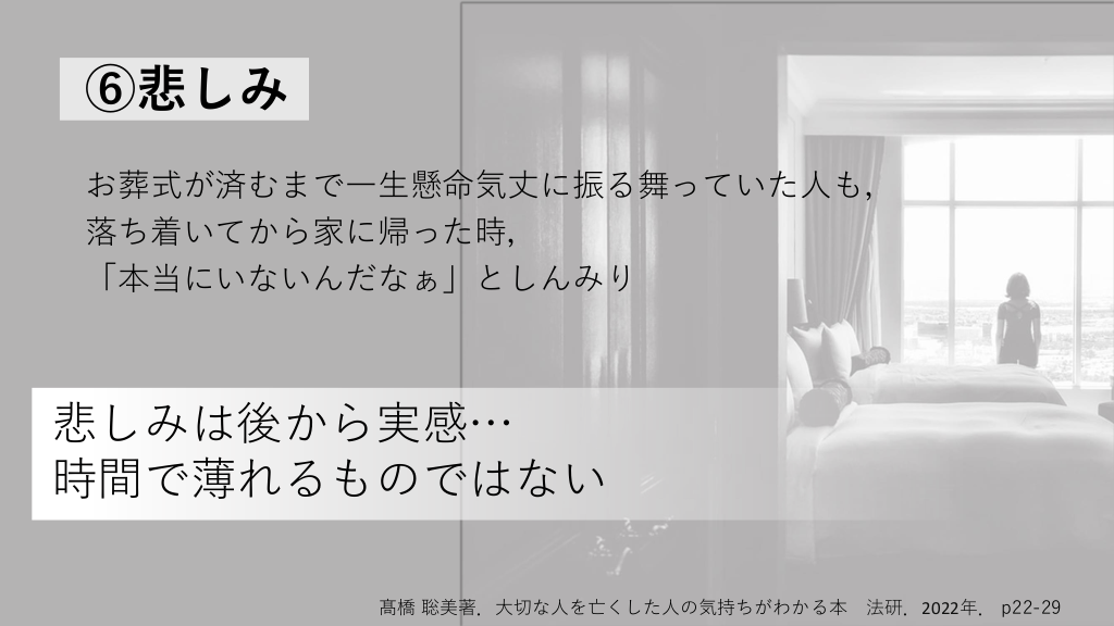 ⑥悲しみ お葬式が済むまで一生懸命気丈に振る舞っていた人も, 落ち着いてから家に帰った時, 「本当にいないんだなぁ」としんみり 悲しみは後から実感… 時間で薄れるものではない 髙橋 聡美著.大切な人を亡くした人の気持ちがわかる本 法研.2022年. p22-29 #17.