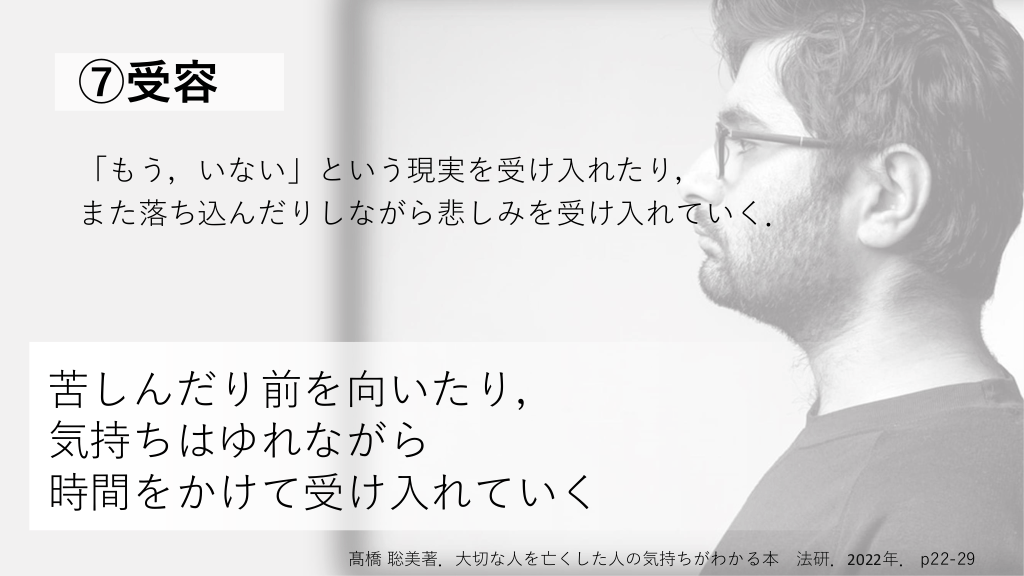 ⑦受容 「もう,いない」という現実を受け入れたり, また落ち込んだりしながら悲しみを受け入れていく. 苦しんだり前を向いたり, 気持ちはゆれながら 時間をかけて受け入れていく 髙橋 聡美著.大切な人を亡くした人の気持ちがわかる本 法研.2022年. p22-29 #18.