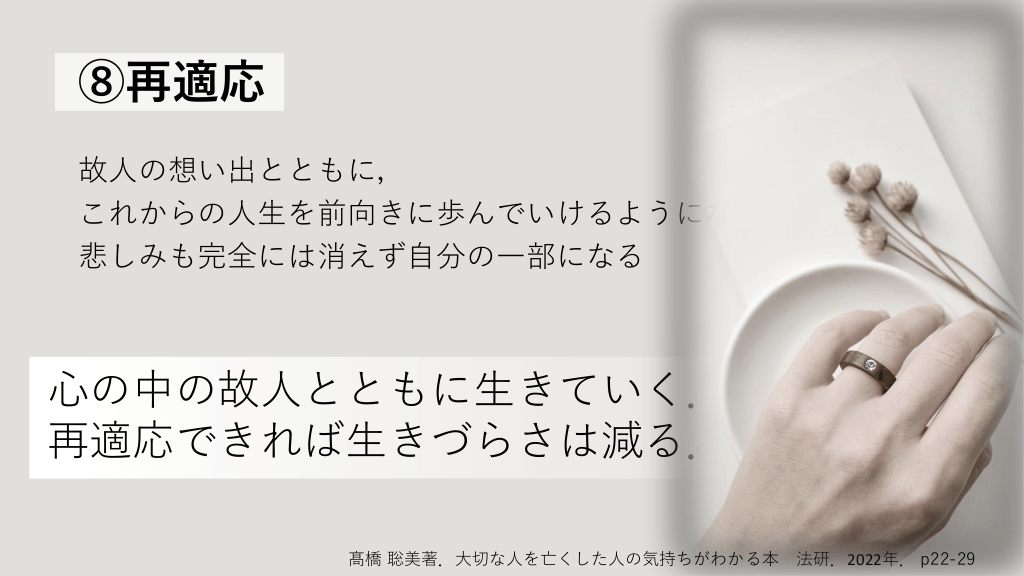 ⑧再適応 故人の想い出とともに, これからの人生を前向きに歩んでいけるようになる状態. 悲しみも完全には消えず自分の一部になる 心の中の故人とともに生きていく. 再適応できれば生きづらさは減る. 髙橋 聡美著.大切な人を亡くした人の気持ちがわかる本 法研.2022年. p22-29 急性悲嘆と複雑性悲嘆の医学的側面 #19.
