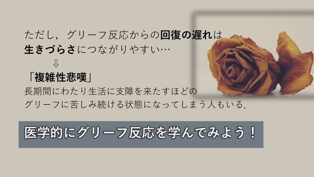 ただし,グリーフ反応からの回復の遅れは 生きづらさにつながりやすい… ⇩ 「複雑性悲嘆」 長期間にわたり生活に支障を来たすほどの グリーフに苦しみ続ける状態になってしまう人もいる. 医学的にグリーフ反応を学んでみよう! #20.