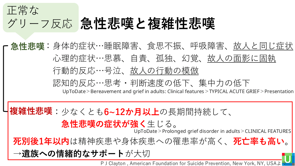 正常な グリーフ反応 急性悲嘆と複雑性悲嘆 急性悲嘆:身体的症状…睡眠障害、食思不振、呼吸障害、故人と同じ症状 心理的症状…思慕、自責、孤独、幻覚、故人の面影に固執 行動的反応…号泣、故人の行動の模倣 認知的反応…思考・判断速度の低下、集中力の低下 UpToDate>Bereavement and grief in adults: Clinical features>TYPICAL ACUTE GRIEF>Presentation 複雑性悲嘆:少なくとも6~12か月以上の長期間持続して、 急性悲嘆の症状が強く生じる。 UpToDate>Prolonged grief disorder in adults>CLINICAL FEATURES 死別後1年以内は精神疾患や身体疾患への罹患率が高く、死亡率も高い。 →遺族への情緒的なサポートが大切 P J Clayton , American Foundation for Suicide Prevention, New York, NY, USAより #22.
