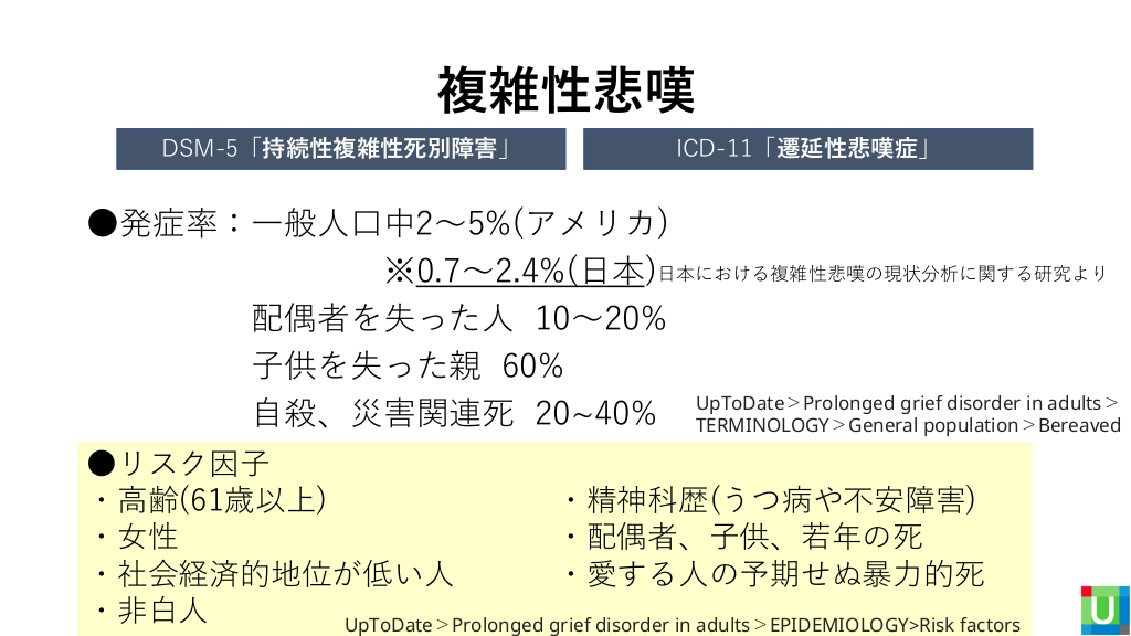 複雑性悲嘆 DSM-5「持続性複雑性死別障害」 ICD-11「遷延性悲嘆症」 ●発症率:一般人口中2~5%(アメリカ) ※0.7~2.4%(日本)日本における複雑性悲嘆の現状分析に関する研究より 配偶者を失った人 10~20% 子供を失った親 60% UpToDate>Prolonged grief disorder in adults> 自殺、災害関連死 20~40% TERMINOLOGY>General population>Bereaved ●リスク因子 ・高齢(61歳以上) ・精神科歴(うつ病や不安障害) ・女性 ・配偶者、子供、若年の死 ・社会経済的地位が低い人 ・愛する人の予期せぬ暴力的死 ・非白人 UpToDate>Prolonged grief disorder in adults>EPIDEMIOLOGY>Risk factors #23.