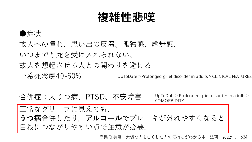 複雑性悲嘆 ●症状 故人への憧れ、思い出の反芻、孤独感、虚無感、 いつまでも死を受け入れられない、 故人を想起させる人との関わりを避ける UpToDate>Prolonged grief disorder in adults>CLINICAL FEATURES →希死念慮40-60% 合併症:大うつ病、PTSD、不安障害 UpToDate>Prolonged grief disorder in adults> COMORBIDITY 正常なグリーフに見えても, うつ病合併したり,アルコールでブレーキが外れやすくなると 自殺につながりやすい点で注意が必要. 髙橋 聡美著.大切な人を亡くした人の気持ちがわかる本 法研.2022年. p34 #24.