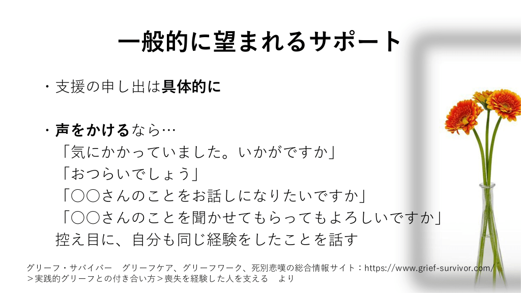 グリーフケアはどうやるの? グリーフワーク=自分の体験に自分なりの解釈と意味を見出すこと. →グリーフに向き合って始まる. 故人のことを思い出し,話し,書いたりしてもらって進むもの. グリーフへの向き合い方に正解はないけど, これをサポートするのがグリーフケア #27. グリーフケアのポイント ・悲しみを表現してもらう ・悲しみを肯定、正常な反応であることを伝える ・個人差があることを認める ・実生活での役割の変化に適応できるよう援助 ・儀式を利用 ・専門家や団体を利用 ・複雑性悲嘆に専門医を紹介 グリーフ・サバイバー グリーフケア、グリーフワーク、死別悲嘆の総合情報サイト:https://www.grief-survivor.com/ >実践的グリーフとの付き合い方 を参考に作成 #28. 一般的に望まれるサポート ・支援の申し出は具体的に ・声をかけるなら… 「気にかかっていました。いかがですか」 「おつらいでしょう」 「○○さんのことをお話しになりたいですか」 「○○さんのことを聞かせてもらってもよろしいですか」 控え目に、自分も同じ経験をしたことを話す グリーフ・サバイバー グリーフケア、グリーフワーク、死別悲嘆の総合情報サイト:https://www.grief-survivor.com/ >実践的グリーフとの付き合い方>喪失を経験した人を支える より 有害支援を避けるための注意点 #29. 一般的に望まれるサポート ・何事もなかったふりをしない 死に触れないのは遺族の孤独感が増す ・正しく何事もなかったように振る舞う 遺族は死を境に人間関係が変化することに戸惑う →自分との変わらない関係があることを示す 以前と同様にイベントとか食事に誘うことが大切 もし断られても“誘ってくれた”ことが相手を孤独にしない グリーフ・サバイバー グリーフケア、グリーフワーク、死別悲嘆の総合情報サイト:https://www.grief-survivor.com/ >実践的グリーフとの付き合い方>喪失を経験した人を支える より #30. 間違った声かけ!有害支援 頑張って。もう少しの辛抱。 ・励ましや激励 奥さんを力づけてやれ。 もっと辛い人がいる。もういい年だったから ・悲しみ比べ 大往生。子供も大きいしまだ良かった。 ・自身やほかの人の体験談 ○○さんは○○して元気になった。 ・気休めの同意 お気持ちはよくわかります。 元気そうで安心した。あなたは強いですね。 ・回復の速さを褒める まだ若いからやりなおせる。次の子供 ・性急に前進することを勧める を作ればいいよ。忘れるのが一番。 グリーフ・サバイバー グリーフケア、グリーフワーク、死別悲嘆の総合情報サイト:https://www.grief-survivor.com/ >実践的グリーフとの付き合い方>喪失を経験した人を支える より #31.