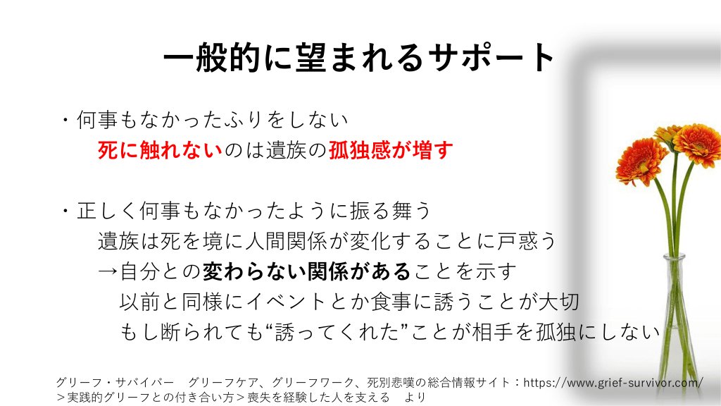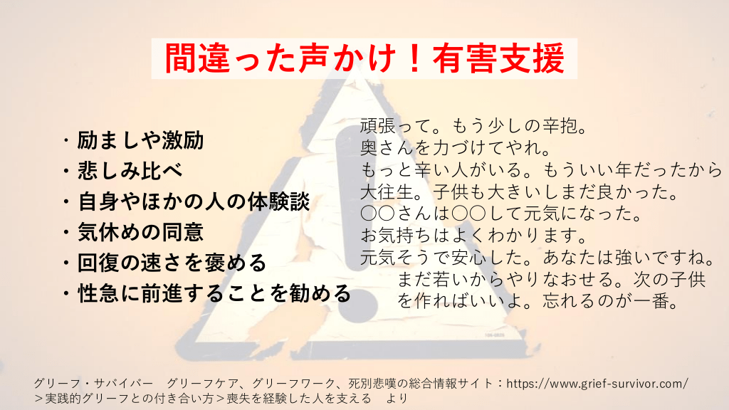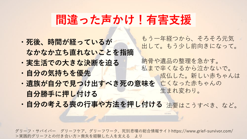 間違った声かけ!有害支援 もう一年経つから、そろそろ元気 出して。もう少し前向きになって。 ・死後、時間が経っているが なかなか立ち直れないことを指摘 納骨や遺品の整理を急かす。 ・実生活での大きな決断を迫る 私まで辛くなるから泣かないで。 ・自分の気持ちを優先 成仏した。新しい赤ちゃんは ・遺族が自分で見つけ出すべき死の意味を 亡くなった赤ちゃんの 生まれ変わり。 自分勝手に押し付ける ・自分の考える喪の行事や方法を押し付ける 法要はこうすべき、など。 グリーフ・サバイバー グリーフケア、グリーフワーク、死別悲嘆の総合情報サイトhttps://www.grief-survivor.com/ >実践的グリーフとの付き合い方>喪失を経験した人を支える より #32.