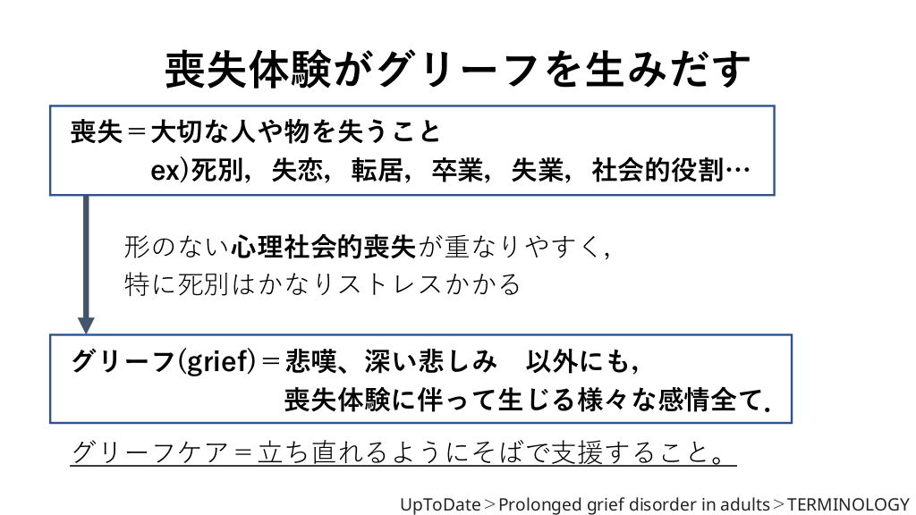喪失体験がグリーフを生みだす 喪失=大切な人や物を失うこと ex)死別,失恋,転居,卒業,失業,社会的役割… 形のない心理社会的喪失が重なりやすく, 特に死別はかなりストレスかかる グリーフ(grief)=悲嘆、深い悲しみ 以外にも, 喪失体験に伴って生じる様々な感情全て. グリーフケア=立ち直れるようにそばで支援すること。 UpToDate>Prolonged grief disorder in adults>TERMINOLOGY #4.
