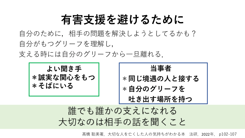 有害支援を避けるために 自分のために,相手の問題を解決しようとしてるかも? 自分がもつグリーフを理解し, 支える時には自分のグリーフから一旦離れる. よい聞き手 *誠実な関心をもつ *そばにいる 当事者 *同じ境遇の人と接する *自分のグリーフを 吐き出す場所を持つ 誰でも誰かの支えになれる 大切なのは相手の話を聞くこと 髙橋 聡美著.大切な人を亡くした人の気持ちがわかる本 法研.2022年. p102-107 医師としてのグリーフ対応とメッセージ #33.