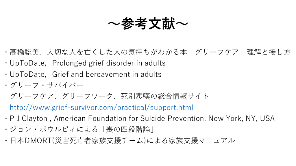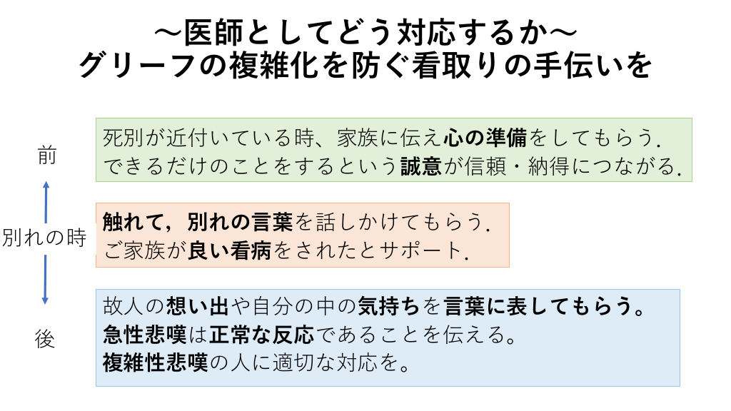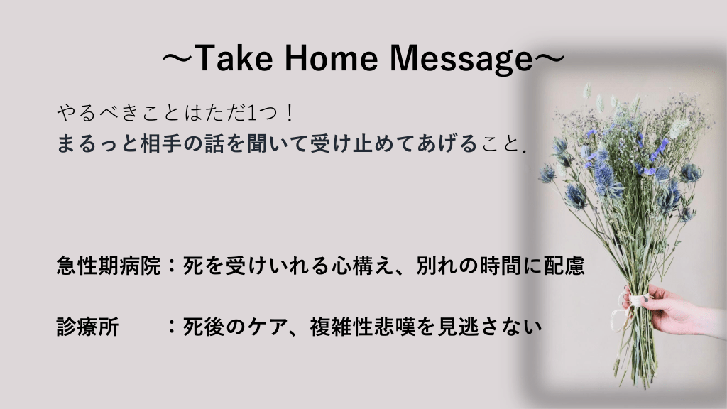 ~Take Home Message~ やるべきことはただ1つ! まるっと相手の話を聞いて受け止めてあげること. 急性期病院:死を受けいれる心構え、別れの時間に配慮 診療所 :死後のケア、複雑性悲嘆を見逃さない #35.