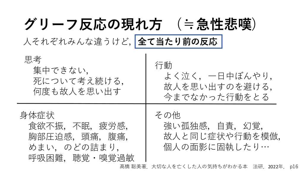 グリーフ反応の現れ方 (≒急性悲嘆) 人それぞれみんな違うけど,全て当たり前の反応 思考 集中できない, 死について考え続ける, 何度も故人を思い出す 身体症状 食欲不振,不眠,疲労感, 胸部圧迫感,頭痛,腹痛, めまい,のどの詰まり, 呼吸困難,聴覚・嗅覚過敏 行動 よく泣く,一日中ぼんやり, 故人を思い出すのを避ける, 今までなかった行動をとる その他 強い孤独感,自責,幻覚, 故人と同じ症状や行動を模倣, 個人の面影に固執したり… 髙橋 聡美著.大切な人を亡くした人の気持ちがわかる本 法研.2022年. p16 #5.