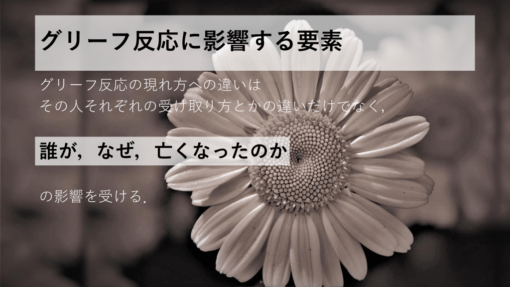 グリーフ反応に影響する要素 グリーフ反応の現れ方への違いは その人それぞれの受け取り方とかの違いだけでなく, 誰が,なぜ,亡くなったのか の影響を受ける. #6.