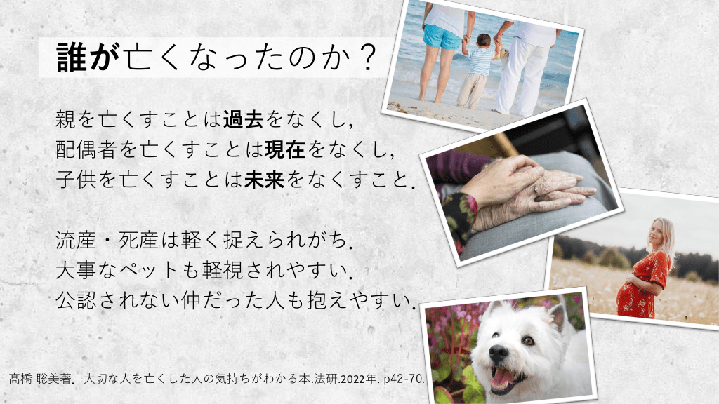 誰が亡くなったのか? 親を亡くすことは過去をなくし, 配偶者を亡くすことは現在をなくし, 子供を亡くすことは未来をなくすこと. 流産・死産は軽く捉えられがち. 大事なペットも軽視されやすい. 公認されない仲だった人も抱えやすい. 髙橋 聡美著.大切な人を亡くした人の気持ちがわかる本.法研.2022年. p42-70. 悲しみの受容プロセスと段階 #7.