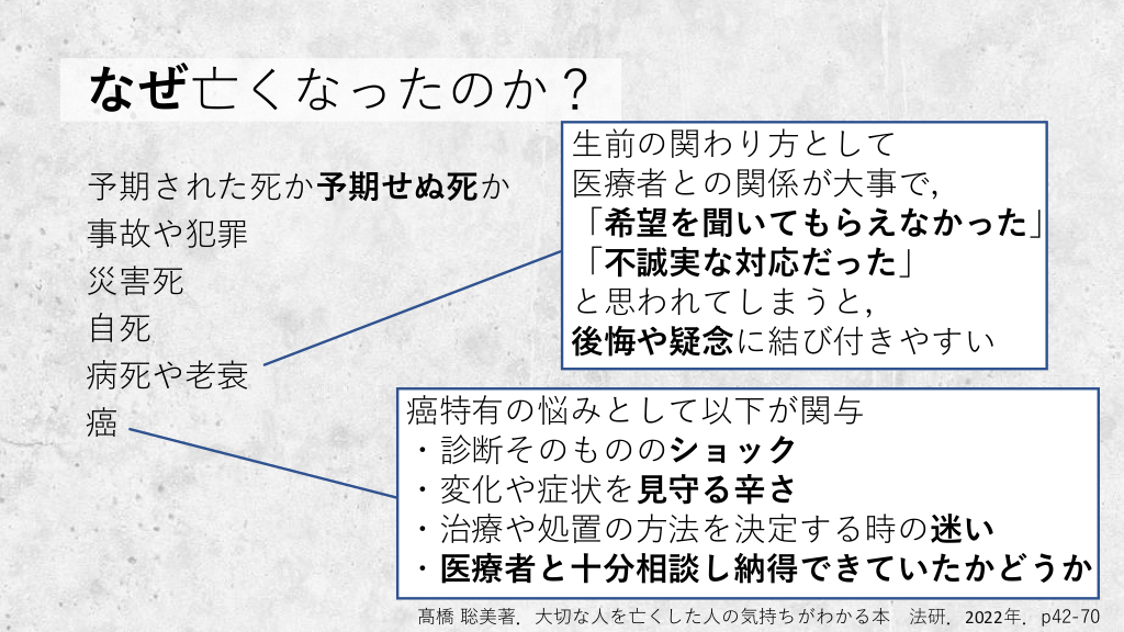 なぜ亡くなったのか? 生前の関わり方として 医療者との関係が大事で, 「希望を聞いてもらえなかった」 「不誠実な対応だった」 と思われてしまうと, 後悔や疑念に結び付きやすい 予期された死か予期せぬ死か 事故や犯罪 災害死 自死 病死や老衰 癌特有の悩みとして以下が関与 癌 ・診断そのもののショック ・変化や症状を見守る辛さ ・治療や処置の方法を決定する時の迷い ・医療者と十分相談し納得できていたかどうか 髙橋 聡美著.大切な人を亡くした人の気持ちがわかる本 法研.2022年.p42-70 #9.
