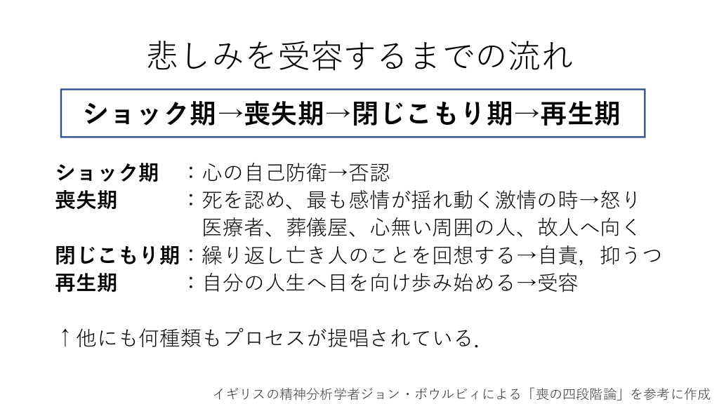 悲しみを受容するまでの流れ ショック期→喪失期→閉じこもり期→再生期 ショック期 喪失期 :心の自己防衛→否認 :死を認め、最も感情が揺れ動く激情の時→怒り 医療者、葬儀屋、心無い周囲の人、故人へ向く 閉じこもり期:繰り返し亡き人のことを回想する→自責,抑うつ 再生期 :自分の人生へ目を向け歩み始める→受容 ↑他にも何種類もプロセスが提唱されている. イギリスの精神分析学者ジョン・ボウルビィによる「喪の四段階論」を参考に作成 #10.