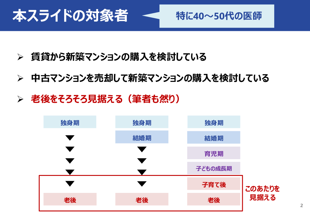 本スライドでは40〜50代の医師のライフスタイルを軸に、新築マンション購入のポイントや購入前に準備すること、金利、理想の住居費などについてまとめております。