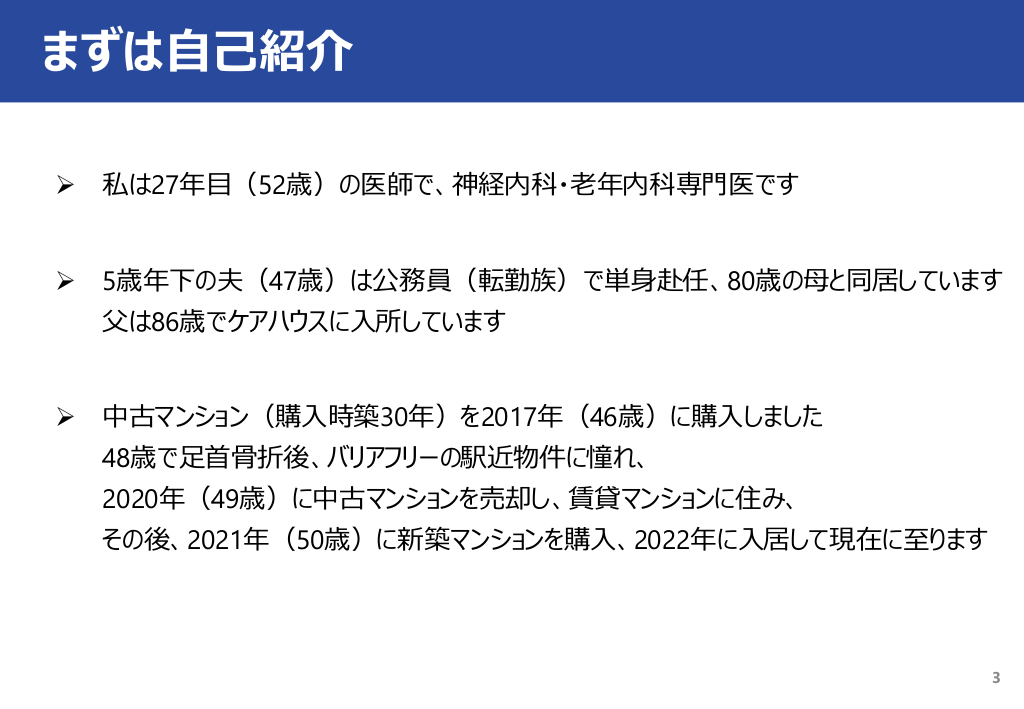 私は27年目(52歳)の神経内科・老年内科専門医で、これまでに賃貸マンション居住、中古マンション/新築マンションの購入を経験しました。