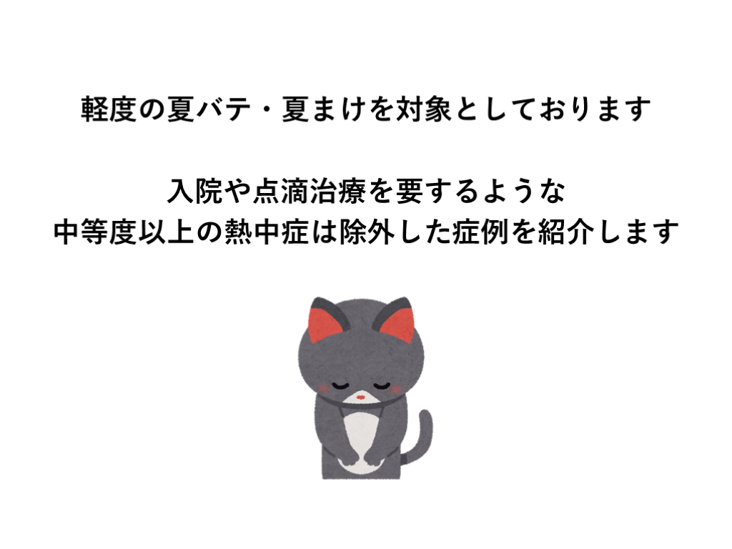 本症例は軽度の夏ばてを対象としていますが、熱中症に対する基本的な考えには変わりありません。