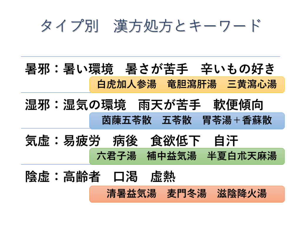 #5. タイプ別 漢方処方とキーワード 白虎加人参湯 竜胆瀉肝湯 三黄瀉心湯 茵蔯五苓散 五苓散 胃苓湯+香蘇散 六君子湯 補中益気湯 半夏白朮天麻湯 清暑益気湯 麦門冬湯 滋陰降火湯