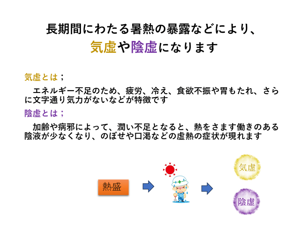 例えば、 暑さ 例えば、 湿気 例えば、 疲労 例えば、 加齢 暑邪 湿邪 気虚 陰虚