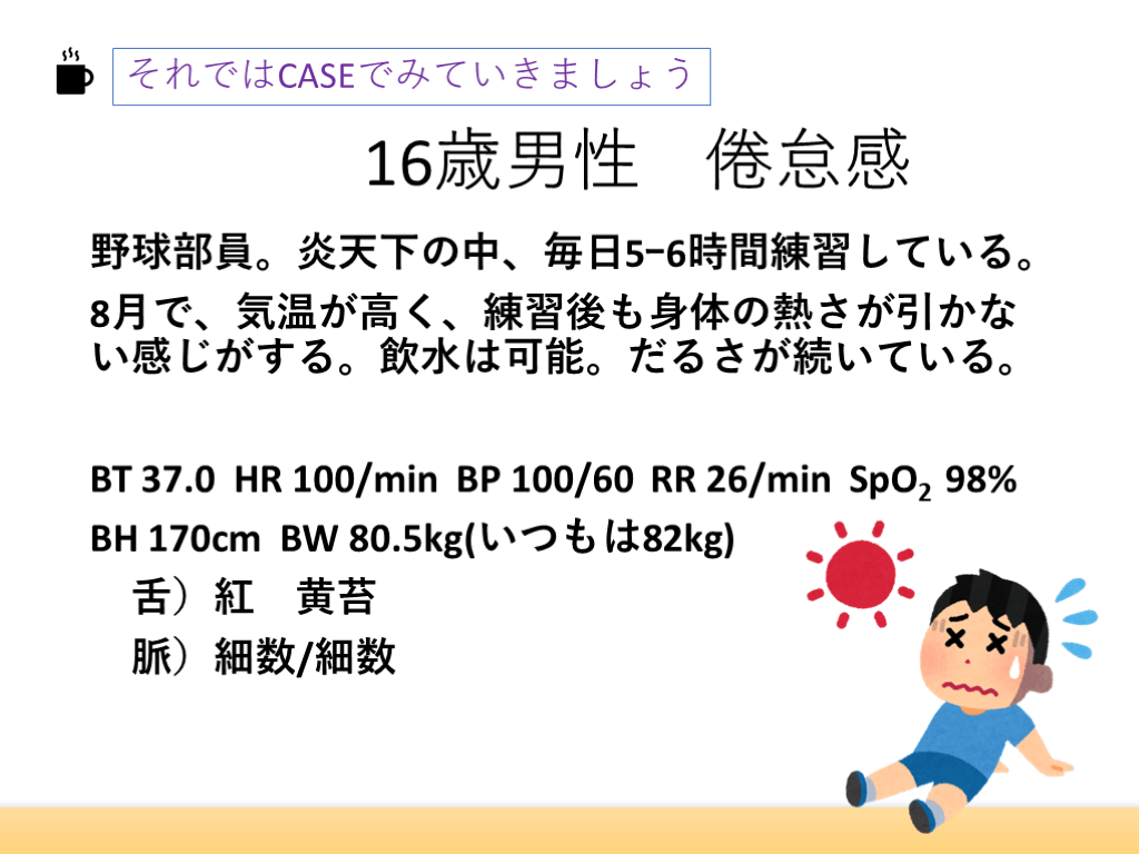 #8. 16歳男性 倦怠感 野球部員。炎天下の中、毎日5ー6時間練習している。