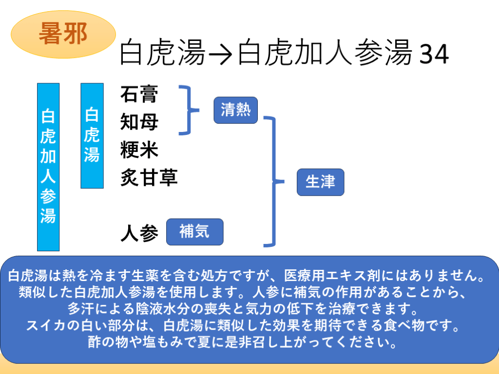 人参 白虎湯 白虎加人参湯 清熱 生津 暑邪 補気 白虎湯は熱を冷ます生薬を含む処方ですが、医療用エキス剤にはありません。類似した白虎加人参湯を使用します。人参に補気の作用があることから、 多汗による陰液水分の喪失と気力の低下を治療できます。