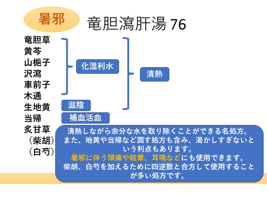 (白芍) 清熱 化湿利水 滋陰 補血活血 暑邪 清熱しながら余分な水を取り除くことができる名処方。 また、地黄や当帰など潤す処方も含み、渇かしすぎないという利点もあります。