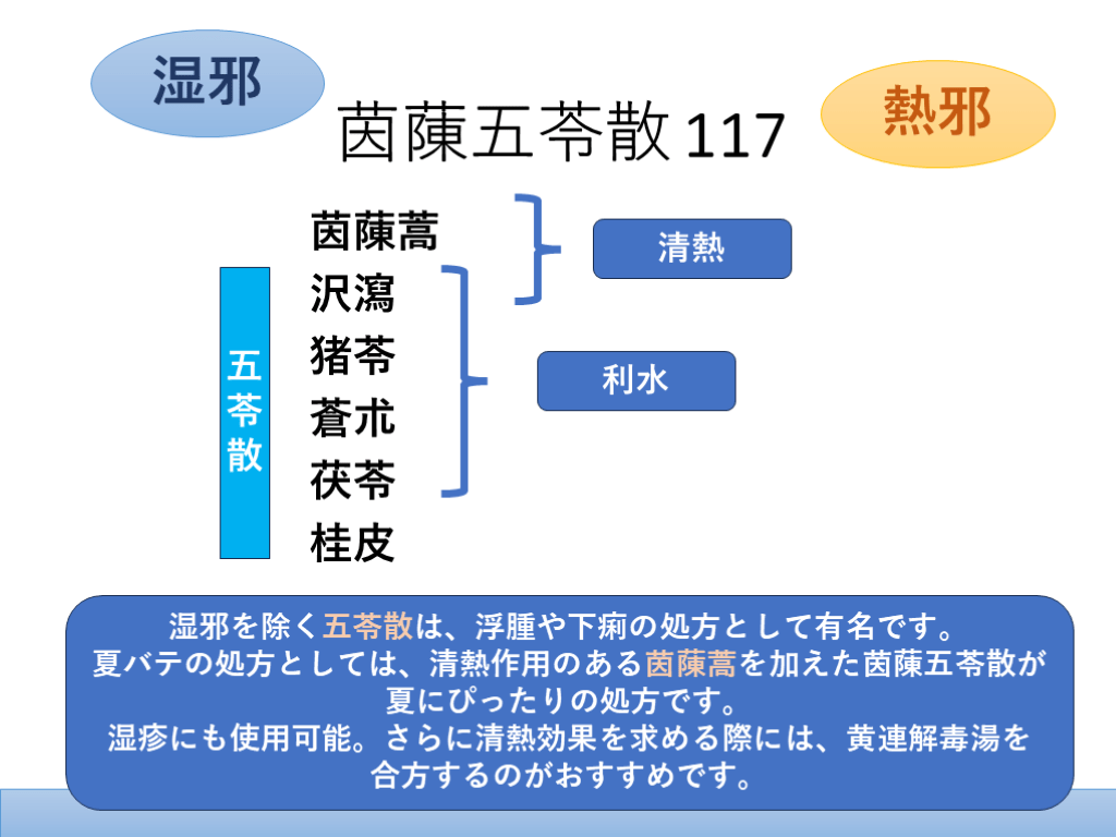 夏バテの処方としては、清熱作用のある茵蔯蒿を加えた茵蔯五苓散が夏にぴったりの処方です。