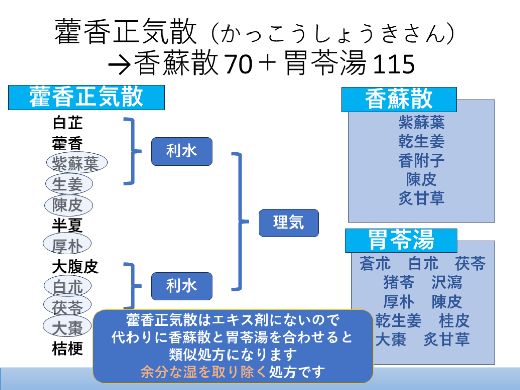 大棗 炙甘草 胃苓湯 藿香正気散はエキス剤にないので 代わりに香蘇散と胃苓湯を合わせると 類似処方になります