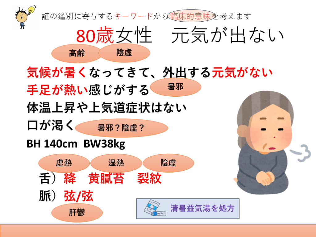 脈)弦/弦 暑邪 暑邪?陰虚? 陰虚 高齢 陰虚 証の鑑別に寄与するキーワードから 臨床的意味 を考えます 虚熱 湿熱 肝鬱 清暑益気湯を処方
