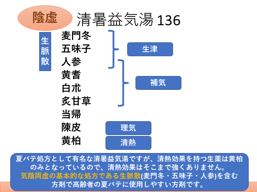 気陰両虚の基本的な処方である生脈散(麦門冬・五味子・人参)を含む 方剤で高齢者の夏バテに使用しやすい方剤です。