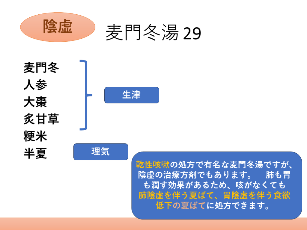 生津 理気 陰虚 乾性咳嗽の処方で有名な麦門冬湯ですが、陰虚の治療方剤でもあります。 肺も胃も潤す効果があるため、咳がなくても 肺陰虚を伴う夏ばて、胃陰虚を伴う食欲低下の夏ばてに処方できます。
